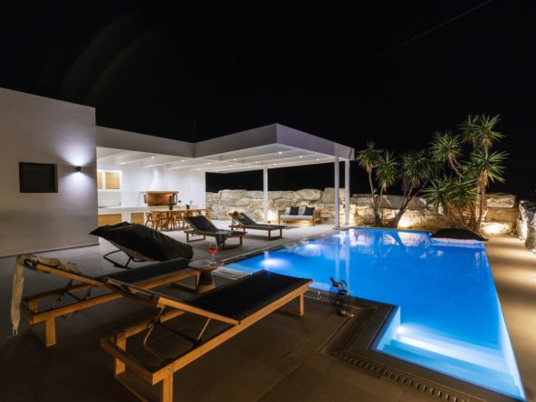 The pool area is equipped with sunbeds, pool poufs, and a redefined outdoor living space perfectly paired with a comfortable sofa, two armchairs, and a gas fireplace – ideal for relaxation and enjoying magical summer nights.