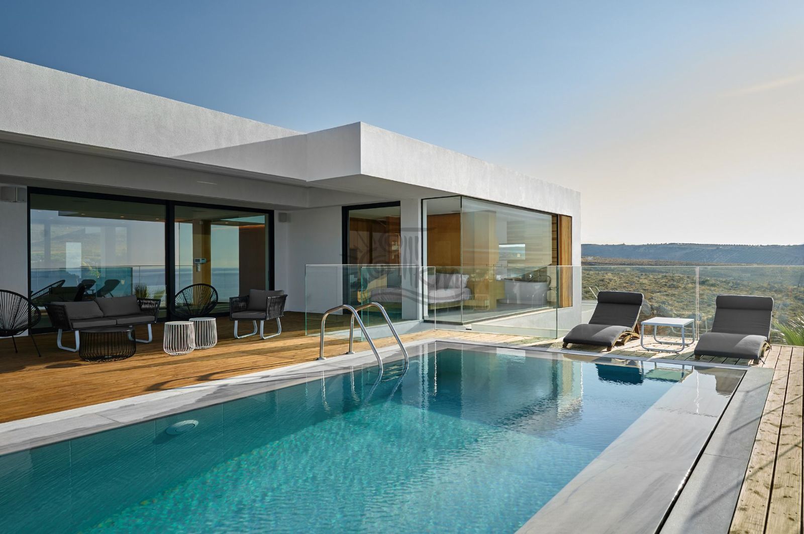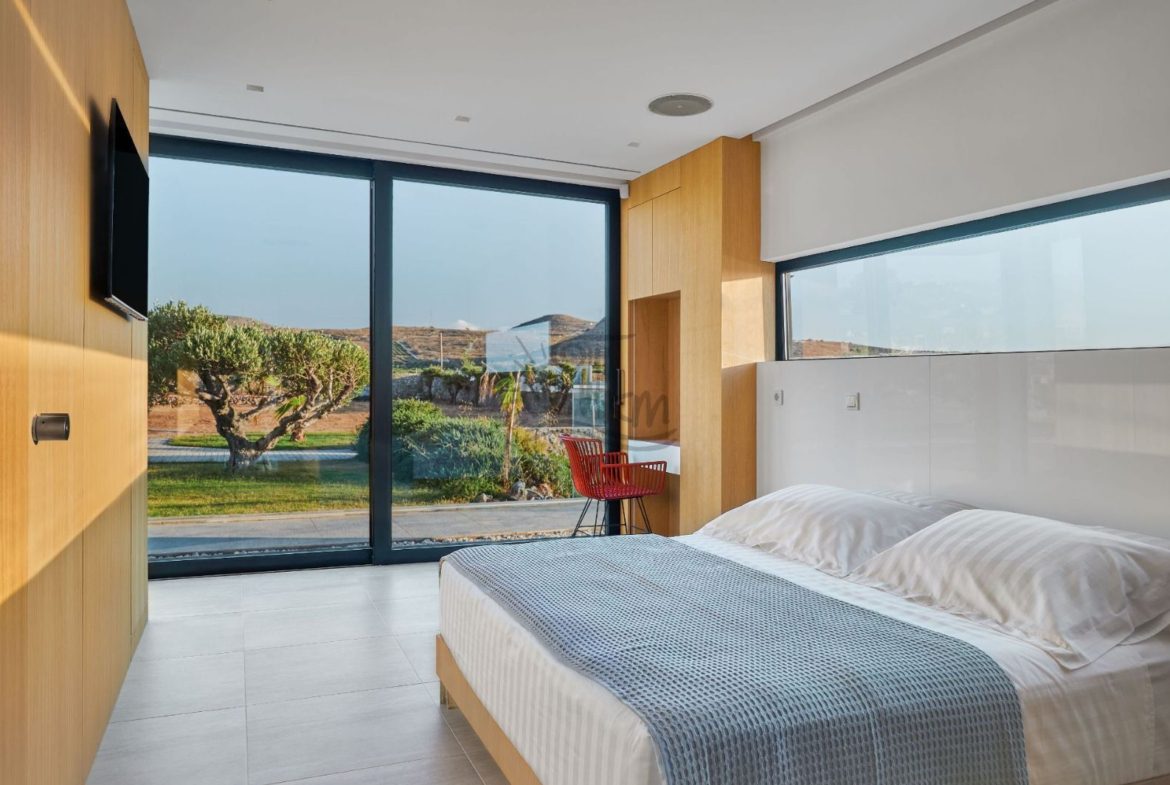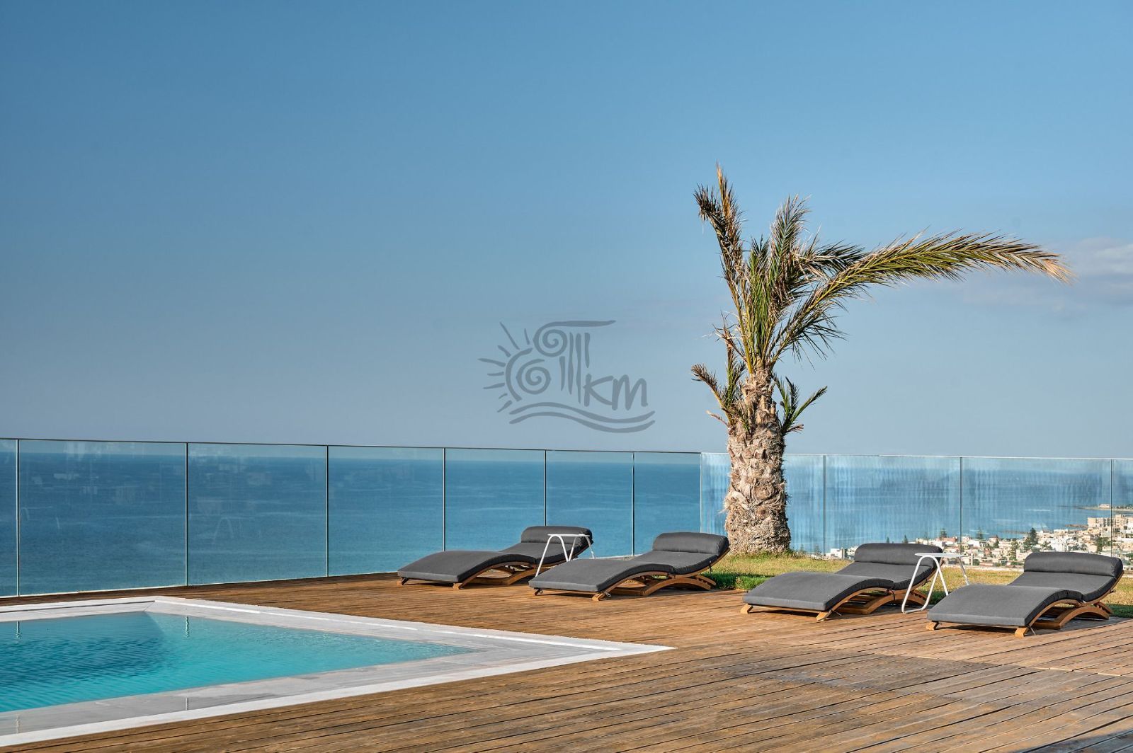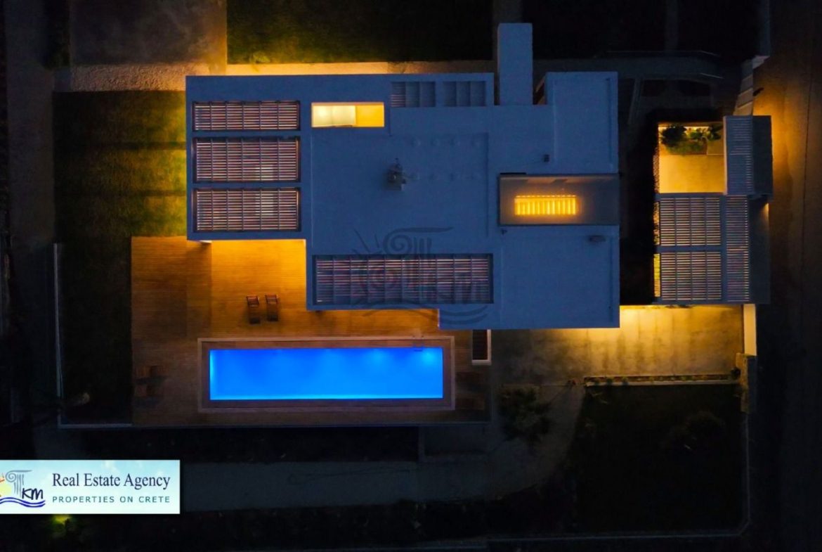 Heraklion. For sale is a 350 sq m ultra-luxurious villa on a 4,000 sq m plot with a unique unobstructed view of the sea. Specifically, it offers complete privacy and is just 8 kilometers from Heraklion international airport and just 2,500 meters from a sandy beach. It is arranged on two levels and has four master bedrooms, the largest of which has a unique view between the pool and the sea. On the first level, there is the open space with the kitchen and the fireplace, while there are the two bedrooms, the imposing patio from which the house is constantly illuminated and very large verandas with direct access to the pool and the surrounding area. In the landscaped surrounding area there is an outdoor dining area with a canopy, a garden with trees and shrubs, aromatic plants of Crete and a barbecue with a wood-burning oven. On the lower level there are two more bedrooms, a gym, a laundry room, with direct access to the gardens, the plot and the closed parking spaces. Finally, the house offers autonomous heating with a heat pump, a 50 sq m heated swimming pool with a heat pump, an alarm and monitoring system, three closed parking spaces, a perimeter stone fence, a lush landscaped garden, trees, shrubs, flowers and aromatic plants. It is an excellent choice either for home ownership or for tourist exploitation.